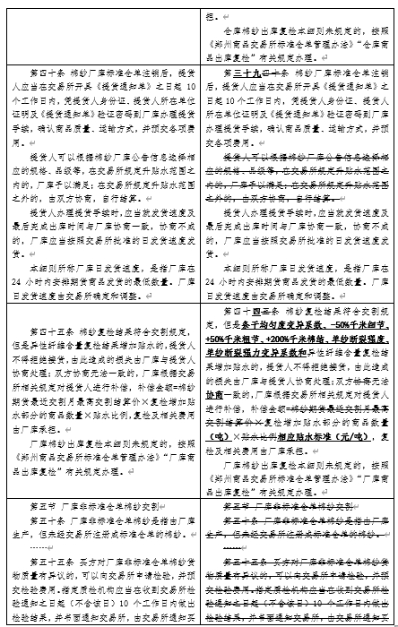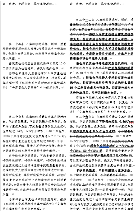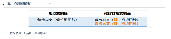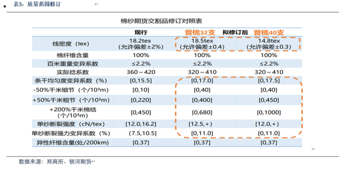 原先受交割品的确定性影响导致整个质量标准设计偏向32支机织用纱使得市场可实用性比较有限,因此本次调整将交割品调整为普梳32支,偏机织用纱并且加入替代交割品40支针、机织用纱;虽然针、机织用纱从生产贸易来看比较同步,但是使用终端有一定区别,由于之前规则对质量有严格要求,导致交割品覆盖面较小,不利于品种发展,未凸显出大宗商品的特点,因此本次修订对捻系数进行调整使得针织纱也可以进入到交割品的范围,并且通过别的指标的组合的方式来明确仓单是针织或者机织,扩大了交割品的范围。