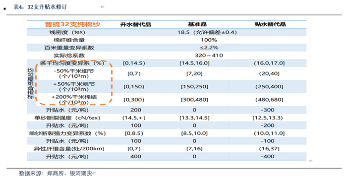 综合来看,32支的升水大概控制在800升水、1000贴水范围;替代交割40支,质量指标以32支为基准,线密度这里做出了升贴水,只要是40支纱将提供1000的升水,主要原因是市场大多数情况40支纱与32支纱直接有1000左右的价差,因此替代交割只要是40支纱就会有支数上的升水,而质量指标升贴水逻辑与32支设定基本一致。