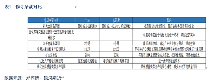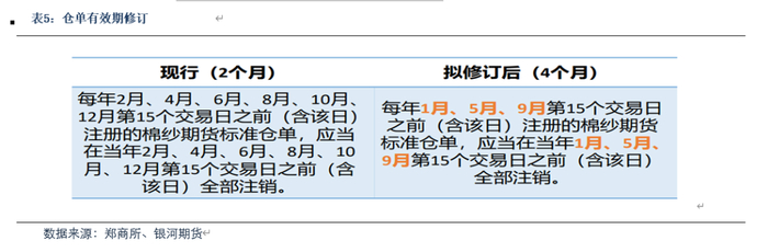 本次对仓单有效期有所延长,现行是2个月,拟修订后调整为4个月。此次调整在注册仓单的时间上更宽裕,一定程度上对企业注册仓单提供了更充足的时间以及便利性;另外从实际来看这个时间也是可以对质量有保障,最大程度的保障仓单纱的质量,对流转效率也有提高。此外,对融资也有一定程度的优化,这样可以更好的使用仓单融资去服务实体企业提供更大的便利性。