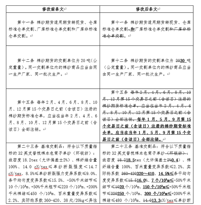 将交割单位由20吨调整为30吨。因为棉纱基本是汽运,一车大概30多吨,这样调整也比较符合现货运输的实际情况,并且对成本也有一定的降低,由于检验费用较高并且检验一般按仓单批次来检验,如果扩大了交割单位,在一定程度上的也对检验成本有一定摊薄。