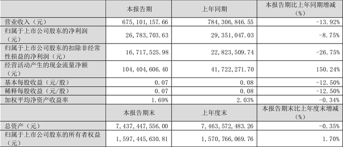 中证智能财讯 凯龙股份(002783)4月30日披露2024年一季报。2024年第一季度,公司实现营业总收入6.75亿元,同比下降13.92%;归母净利润2678.37万元,同比下降8.75%;扣非净利润1671.75万元,同比下降26.75%;经营活动产生的现金流量净额为1.04亿元,同比增长150.24%;报告期内,凯龙股份基本每股收益为0.07元,加权平均净资产收益率为1.69%。