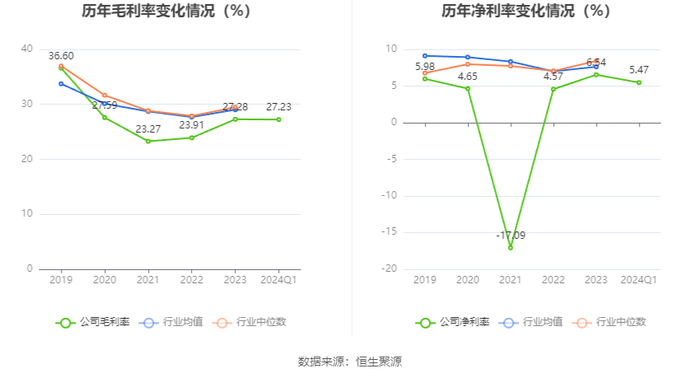 2024年第一季度,公司毛利率为27.23%,同比上升2.37个百分点;净利率为5.47%,较上年同期上升0.60个百分点。