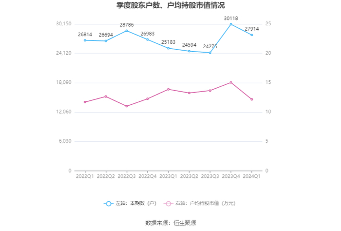 筹码集中度方面,截至2024年一季度末,公司股东总户数为2.79万户,较上年末下降了2204户,降幅7.32%;户均持股市值由上年末的15.06万元下降至12.18万元,降幅为19.12%。