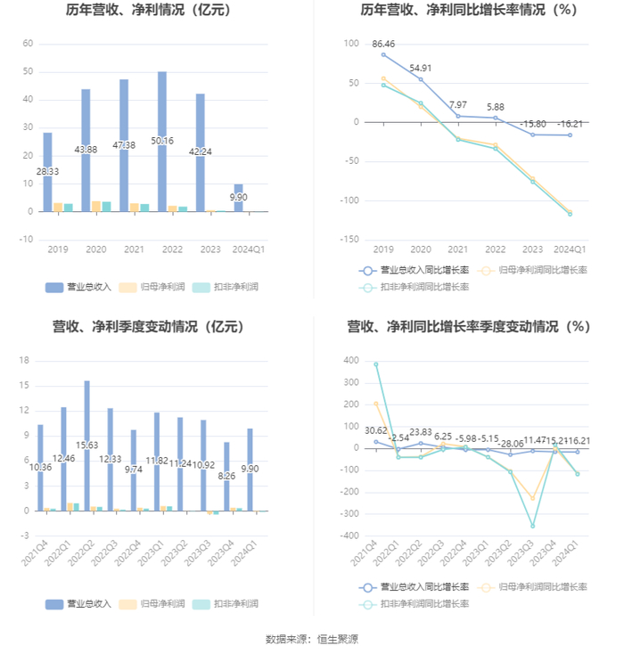 2024年第一季度,公司毛利率为18.97%,同比下降1.94个百分点;净利率为-0.61%,较上年同期下降5.65个百分点。
