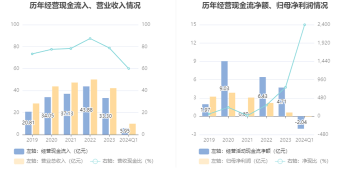 2024年第一季度,公司经营活动现金流净额为-2.04亿元,同比减少2676.58万元,主要系销售收入下降,回款减少所致;筹资活动现金流净额-5248.18万元,同比减少1.41亿元,主要系回购部分社会公众股份所致;投资活动现金流净额-3711.54万元,上年同期为-9578.83万元,主要系上年同期处于工程建设期,资金投入较多所致。