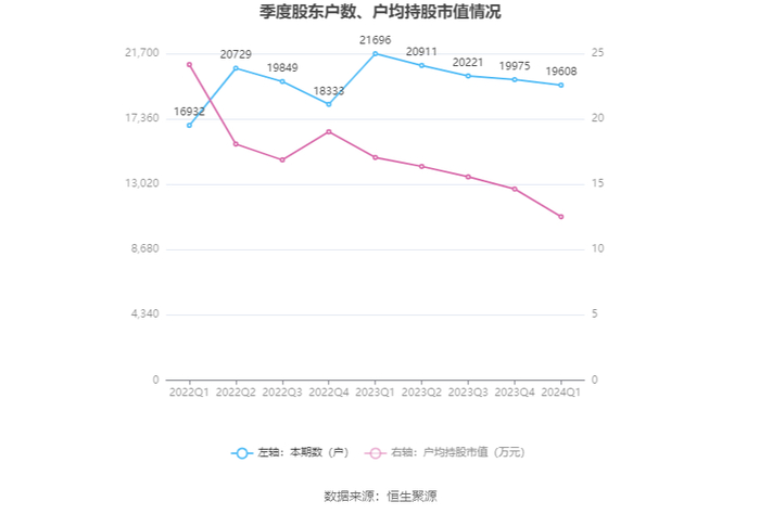 筹码集中度方面,截至2024年一季度末,公司股东总户数为1.96万户,较上年末下降了367户,降幅1.84%;户均持股市值由上年末的14.64万元下降至12.52万元,降幅为14.48%。