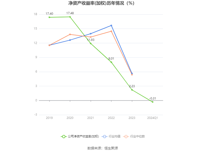 数据显示,2024年第一季度公司加权平均净资产收益率为-0.31%,较上年同期下降2.41个百分点;公司2024年第一季度投入资本回报率为-1.55%,较上年同期下降2.98个百分点。