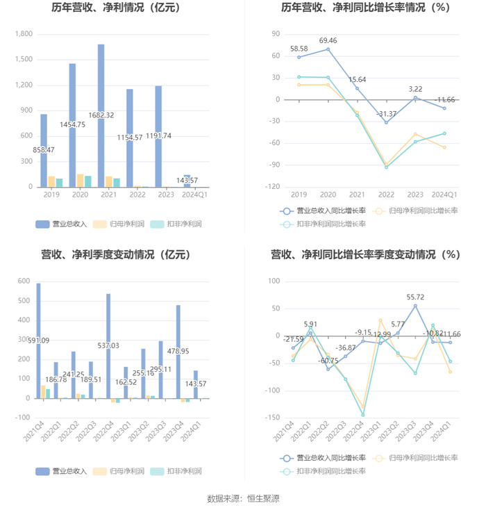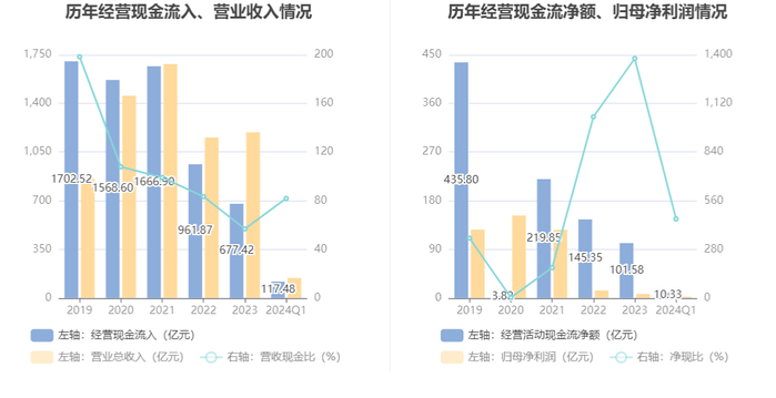 截至2024年一季度末,公司经营活动现金流净额为10.33亿元,同比下降50.7%;筹资活动现金流净额-15.22亿元,同比增加8.57亿元;投资活动现金流净额3.52亿元,上年同期为17.06亿元。