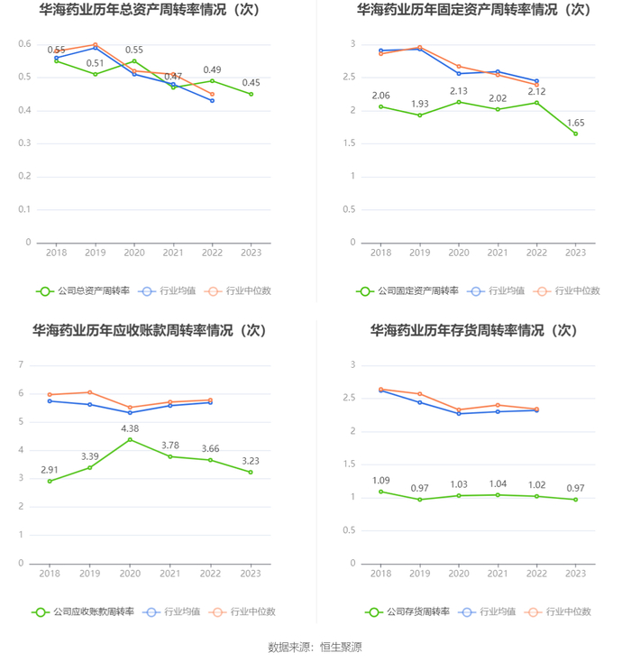 营运能力方面,2023年,公司公司总资产周转率为0.45次,上年同期为0.49次(2022年行业平均值为0.43次,公司位居同行业47/112);固定资产周转率为1.65次,上年同期为2.12次(2022年行业平均值为2.45次,公司位居同行业64/112);公司应收账款周转率、存货周转率分别为3.23次、0.97次。