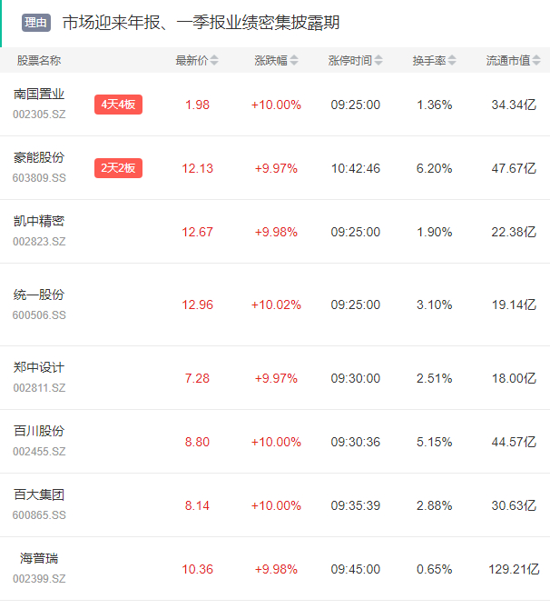 业绩最后的密集披露期,在发布一季报后,多股连续涨停或是今天涨停。南国置业、豪能股份、凯中精密、郑中设计等,股价在发布一季报后连续涨停或是今天发布后涨停。