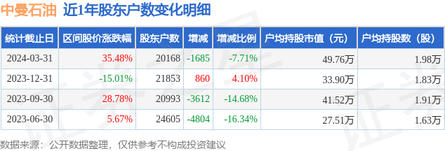 从股价来看,2023年12月31日至2024年3月31日,中曼石油区间涨幅为35.48%,在此期间股东户数减少1685.0户,减幅为7.71%。