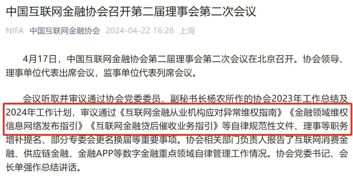 据中国互金协会官网消息,近日中国互联网金融协会第二届理事会第二次会议在北京召开。会议审议通过了《互联网金融从业机构应对异常维权指南》(以下称《异常维权指南》)等自律规范性文件。