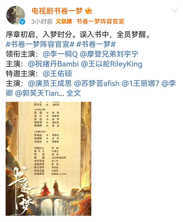 《书卷一梦》官宣阵容,李一桐刘宇宁将解锁“剧本世界”