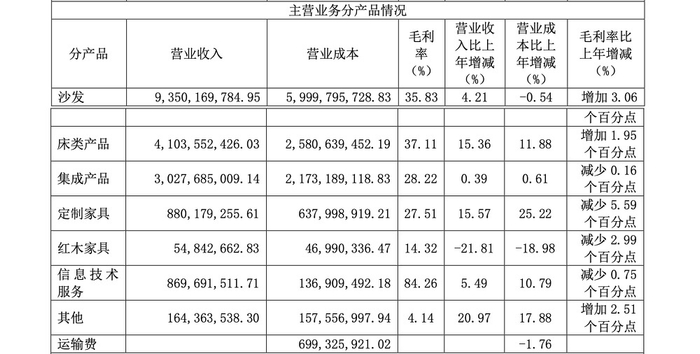 具体到产品上,沙发、床类分别是93.5亿元、41.04亿元的收入。这两大产品均创下公司内部最高的营收记录,沙发品类有望突破百亿。
