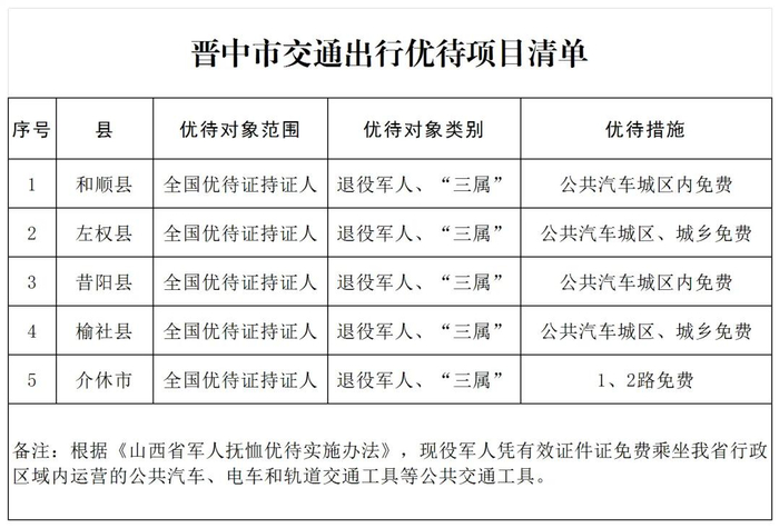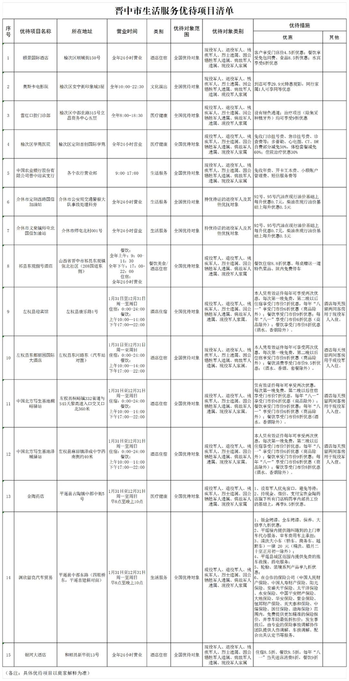 2024年全年,晋中市28家景区、15家生活服务场所、5个县(区、市)交通出行优待项目面向全国现役军人、退役军人和其他优抚对象优待减免,名单如下: