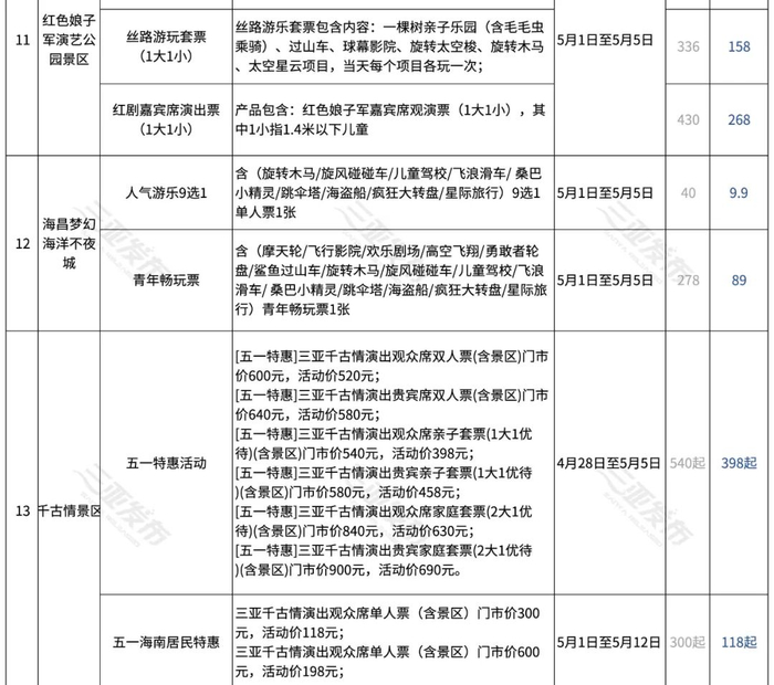 5月1日-5日,三亚丝路欢乐世界游乐项目6选3“五一”特惠88元;游乐通票1大1小“五一”特惠158元;《红色娘子军》实景演出门票1大1小“五一”特惠268元。