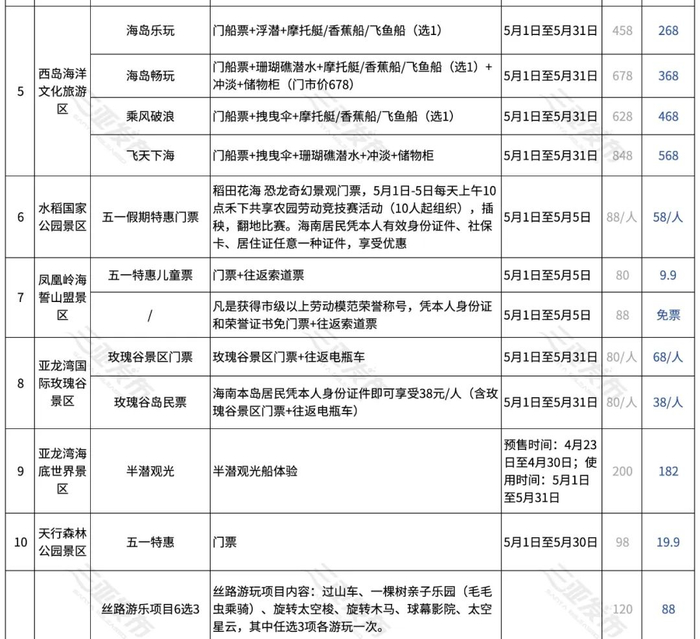 3、5月9日-29日期间,景区推出蜈支洲探索潜水培训(双人优惠票),套票包含上下岛门船票、蜈支洲探索潜水,原价1180元/人,双人优惠价1005元/人。
