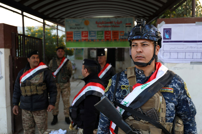 2023年12月18日,伊拉克举行省级议会选举。图为安全人员在伊拉克巴格达一处投票站外警戒。新华社发(哈利勒·达伍德摄)
