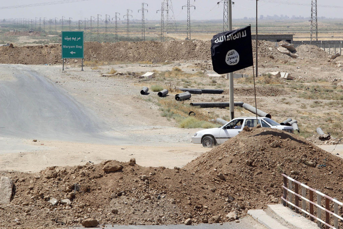 2014年8月23日,在伊拉克北部城市基尔库克一条通往提克里特的公路上,极端组织“伊斯兰国”的黑色旗帜插在双方划定的“边界”上。新华社发(迪娜·阿萨德摄)