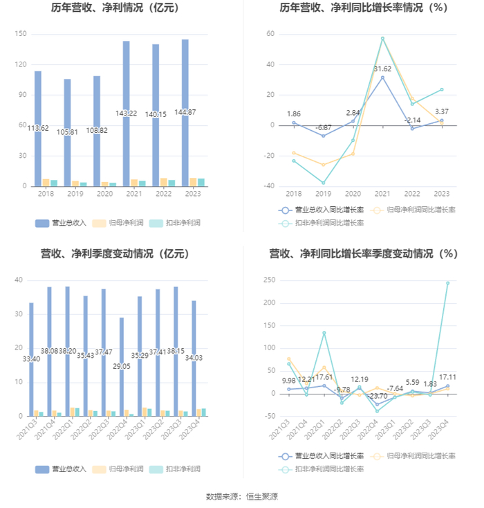 2023年,公司毛利率为15.45%,同比上升2.21个百分点;净利率为5.74%,较上年同期下降0.09个百分点。从单季度指标来看,2023年第四季度公司毛利率为18.68%,同比上升1.10个百分点,环比上升5.34个百分点;净利率为6.49%,较上年同期下降0.16个百分点,较上一季度上升1.99个百分点。