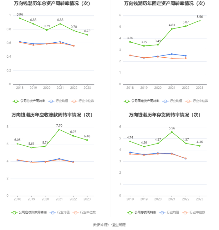 营运能力方面,2023年,公司公司总资产周转率为0.72次,上年同期为0.78次(2022年行业平均值为0.56次,公司位居同行业17/98);固定资产周转率为5.56次,上年同期为5.07次(2022年行业平均值为2.49次,公司位居同行业11/98);公司应收账款周转率、存货周转率分别为6.48次、4.36次。