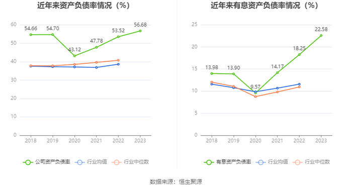 在偿债能力方面,公司2023年年末资产负债率为56.68%,相比上年末上升3.16个百分点;有息资产负债率为22.58%,相比上年末上升4.33个百分点。
