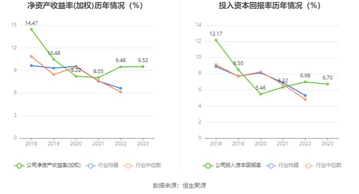 数据显示,2023年公司加权平均净资产收益率为9.52%,较上年同期增长0.04个百分点;公司2023年投入资本回报率为6.70%,较上年同期下降0.28个百分点。