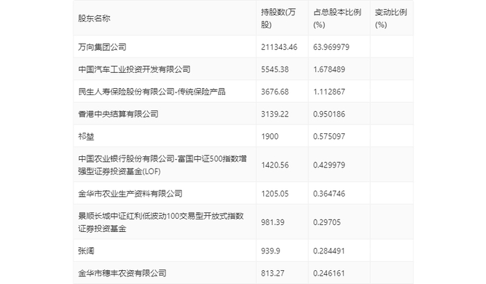 年报显示,2023年年末公司十大流通股东中,新进股东为景顺长城中证红利低波动100交易型开放式指数证券投资基金,取代了三季度末的中证500交易型开放式指数证券投资基金。在具体持股比例上,万向集团公司、中国农业银行股份有限公司-富国中证500指数增强型证券投资基金(LOF)、金华市农业生产资料有限公司持股有所上升,香港中央结算有限公司、金华市穗丰农资有限公司持股有所下降。