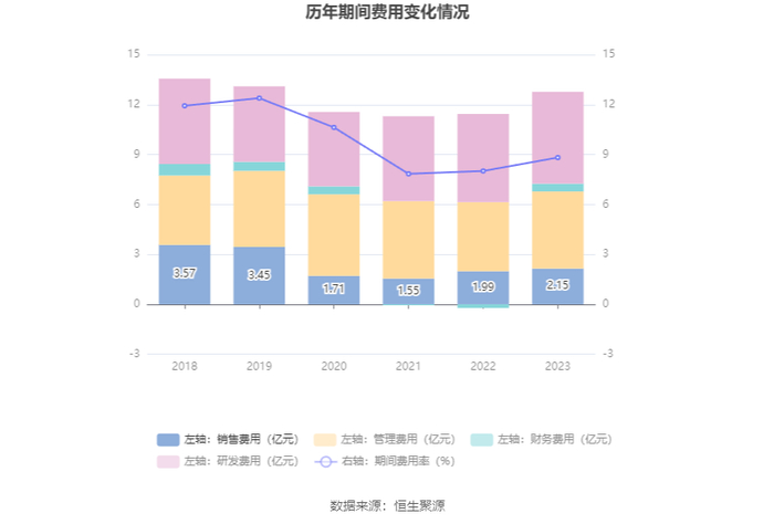 2023年,公司期间费用为12.77亿元,较上年同期增加1.54亿元;期间费用率为8.82%,较上年同期上升0.81个百分点。其中,销售费用同比增长8.43%,管理费用同比增长11.45%,研发费用同比增长4.07%,财务费用由去年同期的-2166.89万元变为4694.05万元。