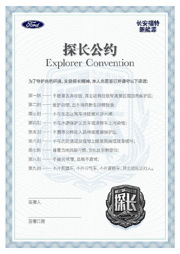 以客户为中心,长安福特新能源为旗舰车型福特探险者车主打造专属用户圈层和共创体验平台“福探长俱乐部——探长行动”,每一位支持践行环保、公益的探险者车主皆可签署《福探长公约》,成为一名福探长。目前福探长俱乐部已汇聚超3.5万名福探长,举办100多场福探长公益行动。从敦煌的防沙行动,到三江源的守护中华水塔,再到崇明岛、海南的湿地生态修复,福探长们在“走四方、见远山”探索大美的同时,也心怀大爱践行环保公益,书写着属于这个时代的探险者精神新篇章。此次500位探险者新车主加冕福探长,正是“福探长公益精神”的薪火传承。