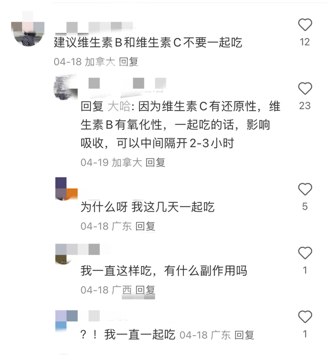 此外,不少人疑惑“维B和维C到底能不能一起服用?”有网友“科普”:维生素C有还原性,维生素B有氧化性,一起吃会影响吸收,最好间隔2-3小时。对此,程清表示,维生素互相之间的拮抗作用比较少见,一般不会影响,但部分维生素可能会影响矿物质的吸收,比如大量服用维生素c后可能导致恶心、腹泻,并且会增加泌尿系统结石的危险,患有蚕豆病的患者接受大剂量的维生素C后可能产生溶血;另外大量维生素C还可能降低抗凝剂的作用,使铁吸收过量,反而促进体内形成自由基。