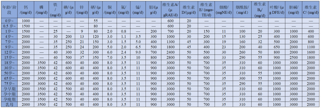 膳食维生素推荐摄入量(RNI)或适宜摄入量(AI)