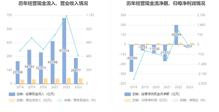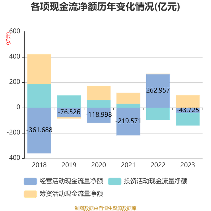 2023年,公司经营活动现金流净额为-43.73亿元,同比减少306.68亿元;筹资活动现金流净额97.29亿元,同比增加91.98亿元;投资活动现金流净额-98.07亿元,上年同期为-97.89亿元。
