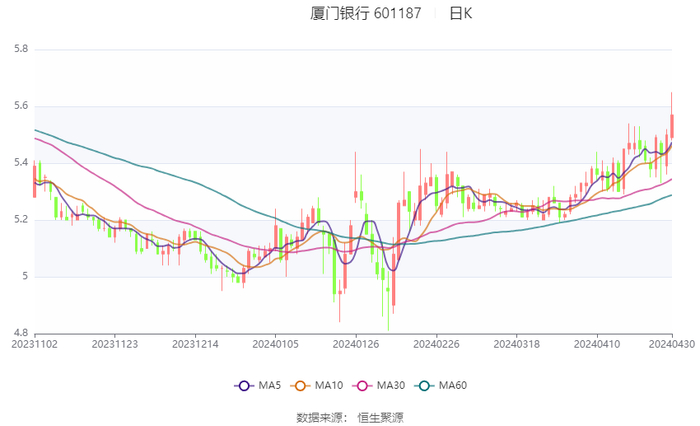 以4月29日收盘价计算,厦门银行目前市盈率(TTM)约为5.45倍,市净率(LF)约0.49倍,市销率(TTM)约2.59倍。