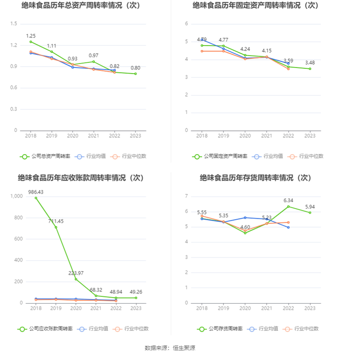 营运能力方面,2023年,公司公司总资产周转率为0.80次,上年同期为0.82次(2022年行业平均值为0.85次,公司位居同行业11/21);固定资产周转率为3.48次,上年同期为3.59次(2022年行业平均值为3.78次,公司位居同行业10/21);公司应收账款周转率、存货周转率分别为49.26次、5.94次。