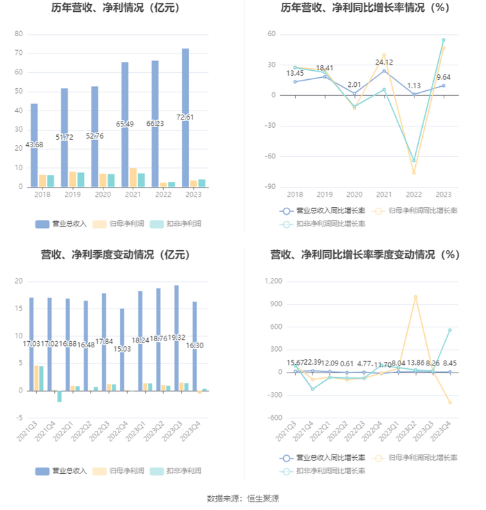 2023年,公司毛利率为24.77%,同比下降0.80个百分点;净利率为4.37%,较上年同期上升1.41个百分点。从单季度指标来看,2023年第四季度公司毛利率为26.90%,同比上升4.42个百分点,环比上升1.13个百分点;净利率为-3.25%,较上年同期下降3.87个百分点,较上一季度下降10.53个百分点。