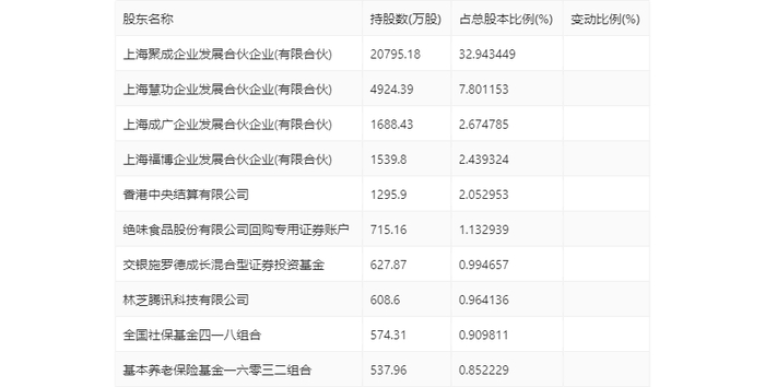 年报显示,2023年年末公司十大流通股东中,新进股东为绝味食品股份有限公司回购专用证券账户、交银施罗德成长混合型证券投资基金,取代了三季度末的新华人寿保险股份有限公司-分红-个人分红-018L-FH002沪、唐颖。在具体持股比例上,全国社保基金四一八组合持股有所上升,香港中央结算有限公司持股有所下降。