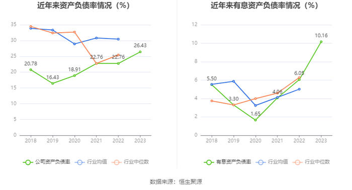 在偿债能力方面,公司2023年年末资产负债率为26.43%,相比上年末上升3.67个百分点;有息资产负债率为10.16%,相比上年末上升4.11个百分点。