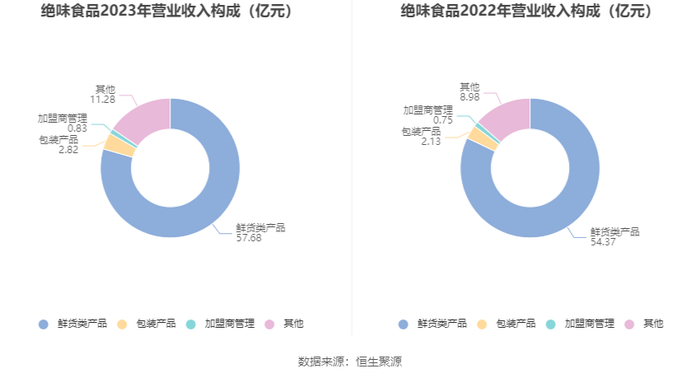 分产品来看,2023年公司主营业务中,鲜货类产品收入57.68亿元,同比增长6.09%,占营业收入的79.44%;包装产品收入2.82亿元,同比增长32.75%,占营业收入的3.89%;加盟商管理收入0.83亿元,同比增长11.38%,占营业收入的1.14%。