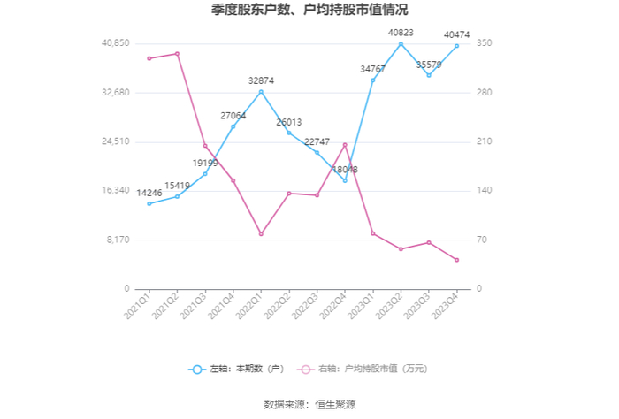筹码集中度方面,截至2023年年末,公司股东总户数为4.05万户,较三季度末增长了4895户,增幅13.76%;户均持股市值由三季度末的66.67万元下降至41.89万元,降幅为37.17%。