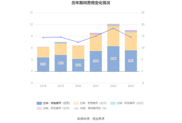 2023年,公司期间费用为10.6亿元,同比减少1.59亿元;期间费用率为14.59%,同比下降3.8个百分点。其中,销售费用同比下降16.3%,管理费用同比下降9.95%,研发费用同比增长10.27%,财务费用同比下降30.57%。