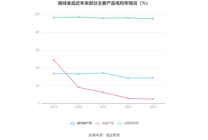 分产品看,鲜货类产品、包装产品、加盟商管理2023年毛利率分别为28.98%、5.02%、95.35%。