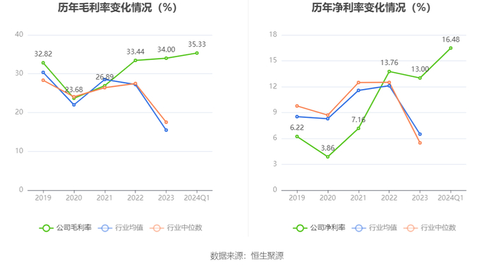 2024年第一季度,公司毛利率为35.33%,同比上升4.31个百分点;净利率为16.48%,较上年同期上升2.97个百分点。