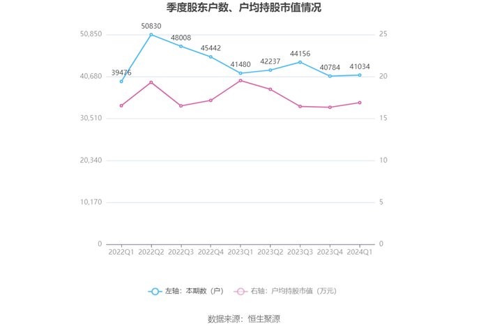 筹码集中度方面,截至2024年一季度末,公司股东总户数为4.1万户,较上年末增长了250户,增幅0.61%;户均持股市值由上年末的16.34万元上升至16.89万元,增幅为3.37%。
