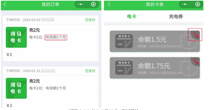 👉记者购买了河马充电的两张电卡,消费后账户余额共3.25元,但有效期仅为1个月,过期后既不能使用也无法退款。河马充电站微信小程序购卡页面显示的电卡售价为2元到200元不等,均设置了1个月至24个月的有效期,“使用细则”中提到:“购买或续费成功后,相应费用不予退还,有关所有商品的使用规则,北京车未科技有限公司保留最终解释权。”记者联系相关客服人员表示,河马电卡在过期前可以申请退款,过期后则不能使用,也无法退款。