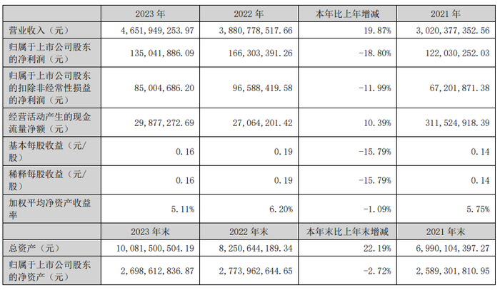 挖贝网4月30日,埃斯顿近日发布2023年年度报告,报告期内公司实现营业收入4,651,949,253.97元,同比增长19.87%;归属于上市公司股东的净利润135,041,886.09元,同比下滑18.80%。