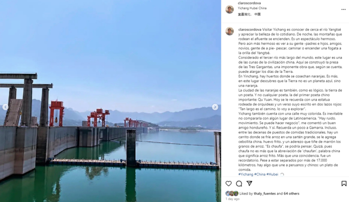 秘鲁《共和报》记者Francisco Claros在个人社交平台上写道:“这里是世界第三长河流——长江,是中华文明的发祥地之一。这里建造了三峡大坝,这是一项巨大工程,通过清洁发电,可以实现人类可持续发展。”