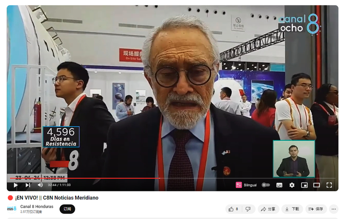 洪都拉斯国家电视台记者Rony Espinoza在洪都拉斯国家电视台第八频道Youtube官方账号上直播报道了首届中拉航天合作论坛展览,并采访了洪都拉斯驻华大使。采访中大使表示,在展览上可以看到中国航天事业全景,特别是近年来中国航天事业取得的成果,非常令人震撼。