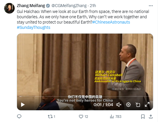 智利普雷森萨通讯社记者Anibal Feres发表了中国航天员与拉美和加勒比国家使节互动的文章,对中国航天员桂海潮所说的“从太空看地球,是没有国界的”这个观点表示深深认同,称航天合作也是共建人类命运共同体。