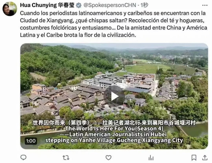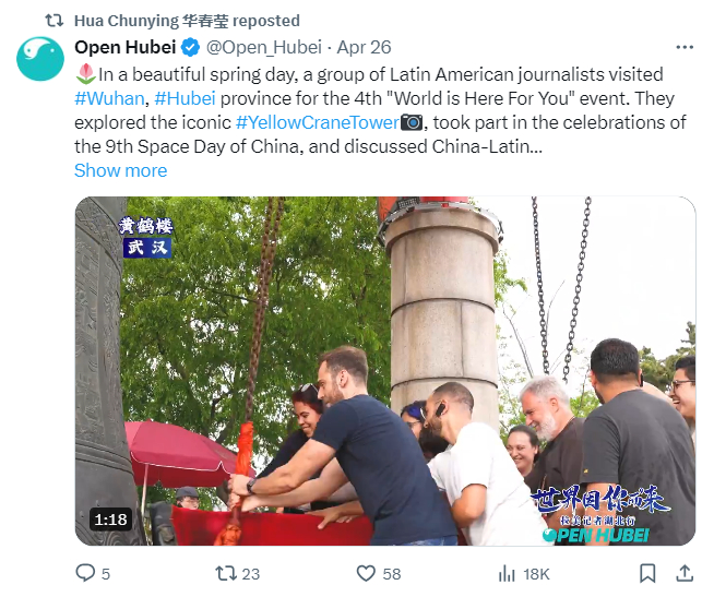 拉美记者们的“湖北行”活动,也得到了外交部和各国驻华大使的关注。“外交部发言人办公室”官方视频号转发两条湖北发布·Open Hubei的独家采访视频。外交部部长助理华春莹、乌拉圭驻华大使费尔南多·卢格里斯、古巴驻华大使白诗德、中国驻巴基斯坦大使馆文化参赞张和清、中国驻贝尔法斯特总领事张美芳等通过他们的社交平台多次转发活动视频,向全球推介湖北。